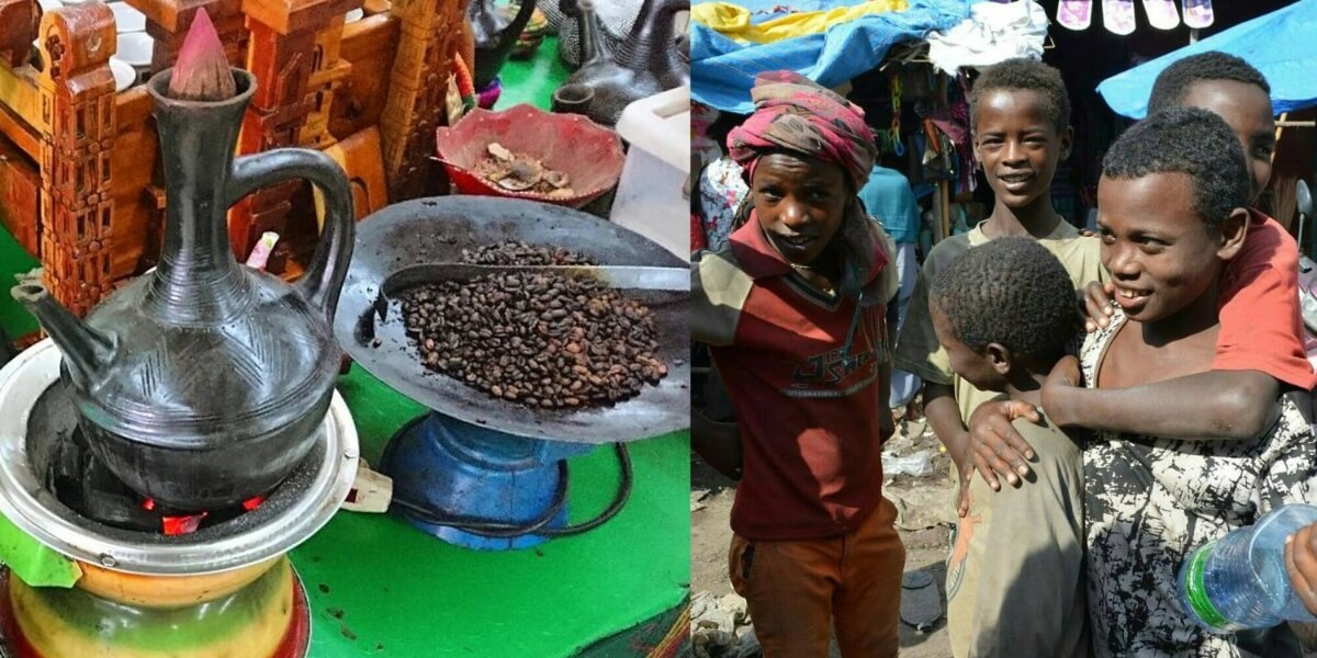 Ethiopians brew coffee without a filter. They place ground coffee beans in a black jebana pot, let them settle, and then boil the beans directly to make their drink.